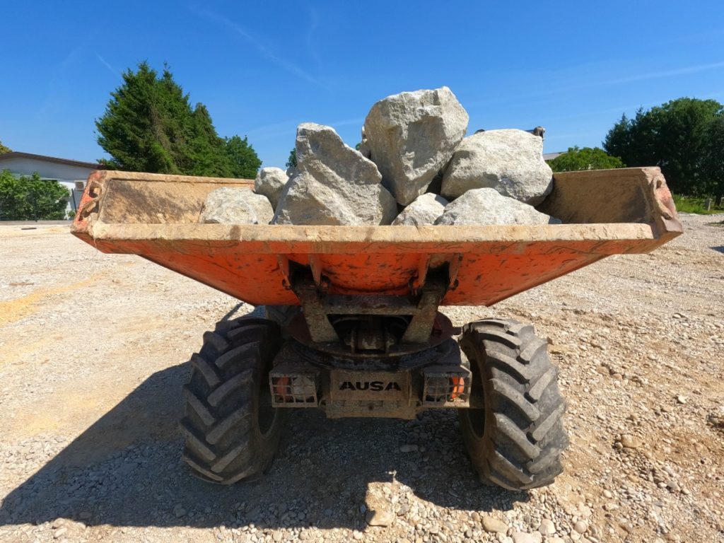 Nalaganje in prevoz kamnov iz parkirišča do lokacije izdelave slapov. Vremenske razmere so bilo zelo vroče in komaj smo čakali na ohladitev.